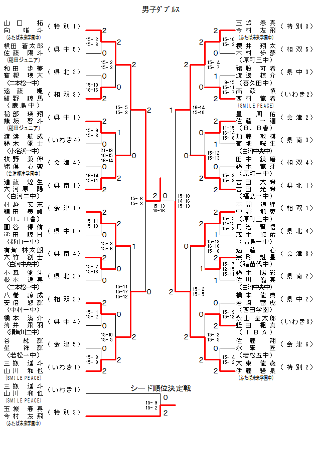 | BD-12 | 福島一中[県北1] | 吉田 大希・吉田 光希 | 2 | 15- 8 15- 8 | 0 | 田中 錬磨・鈴木 龍牙 | 原町一中[相双4] | |