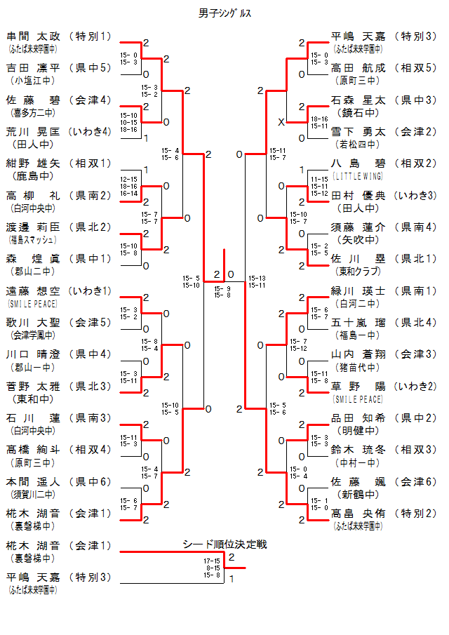| BS-28 | ふたば未来学園中[特別2] | 畠 央侑 | 2 | 15- 5 15- 6 | 0 | 緑川 瑛士 | 白河二中[県南1] | |
