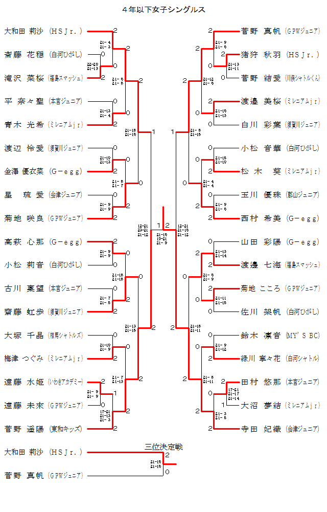 | WS4-12 | 東和キッズ | 菅野 遥陽 | 2 | 17-21 21-13 21- 3 | 1 | 遠藤 水姫 | いわきアカデミー | |