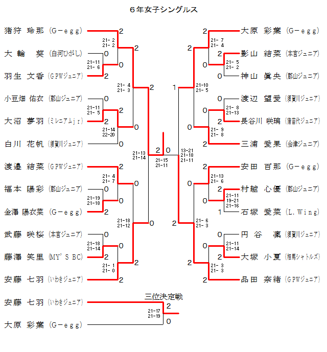 | WS6-1 | GPWJr. | 羽生 文香 | 2 | 21-11 21- 6 | 0 | 大輪 葵 | 白河ひがし | |