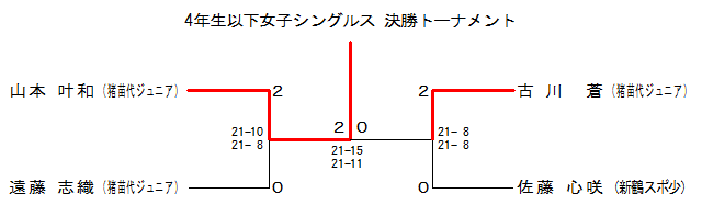 | WS4-2 | 猪苗代Jr. | 古川 蒼 | 2 | 21- 8 21- 8 | 0 | 佐藤 心咲 | 新鶴スポ少 | |