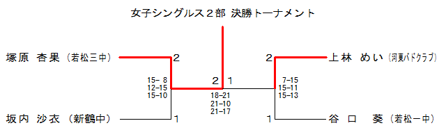| 坂内 沙衣 (新鶴中) | ○ 21-16 21-16 | ○ 21-17 21-16 | 1 |