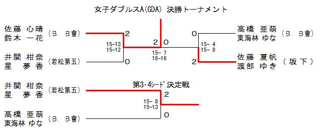 | GDA-2 | 坂下 | 佐藤 夏帆・渡部 ゆき | 2 | 15- 4 15- 8 | 0 | 高橋 亜萌・東海林 ゆな | B.B會 | |