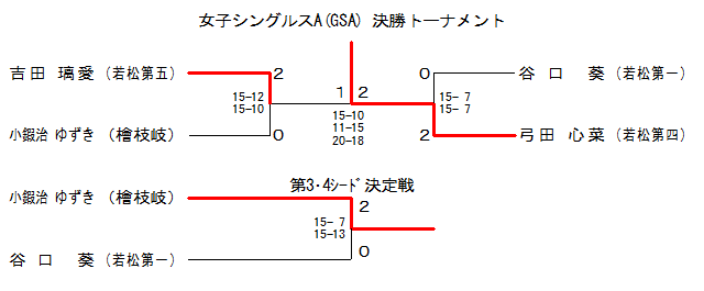 | GSA-2 | 若松第四 | 弓田 心菜 | 2 | 15- 7 15- 7 | 0 | 谷口 葵 | 若松第一 | |