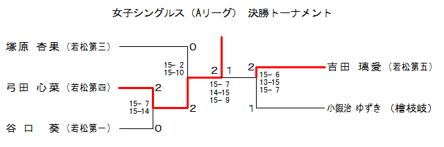 | GSA-3 | 若松第五 | 吉田 璃愛 | 2 | 15- 6 13-15 15- 7 | 1 | 小鍜治ゆずき | 檜枝岐 | |