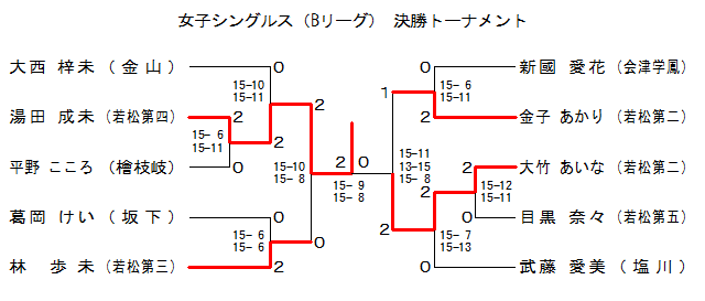 | GSB-5 | 若松第二 | 金子あかり | 2 | 15- 6 15-11 | 0 | 新國 愛花 | 会津学鳳 | |