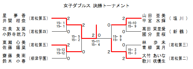 | 齋藤 美南 鈴木 小春 (柳津学園) | ○ 21-16 | ○ 21- 4 | ○ 21-11 | 1 |