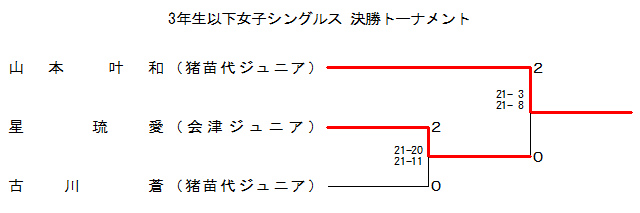 | WS3-1 | ‰ï’ÃJr. | ¯ @—®ˆ¤ | ‚Q | 21-20 21-11 | ‚O | ŒÃì @‘“ | ’–•c‘ãJr. | |